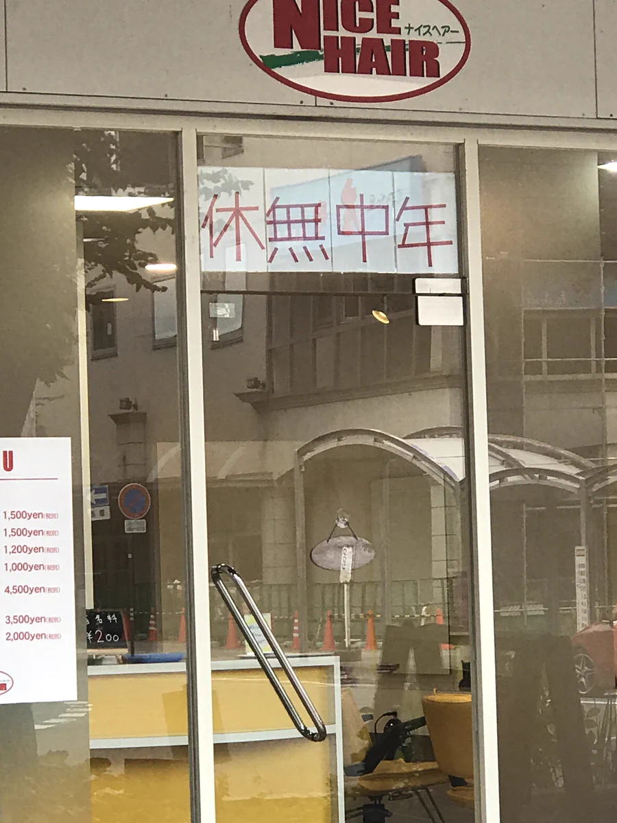 お店の窓に紙で貼ってある文字。いろんなアピールがされていますよね。こちらは床屋さんのようですが、うっかり反対に貼ってしまったようです。『年中無休』となるはずが、読むのが反対になることで、とても悲しくおもしろいメッセージになってしまっています。