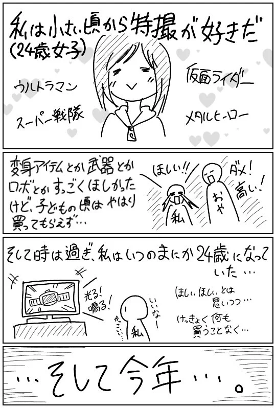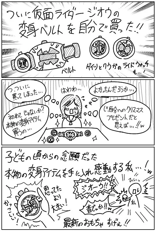 女の子ながらも小さいころから特撮が好きだったツイート主。子供のころは高いからと変身グッズを買ってもらえませんでした。そして大人になった今、ついに変身ベルトを購入!女の子だってやっぱり変身したい!夢が叶ったことにほっこりしますw