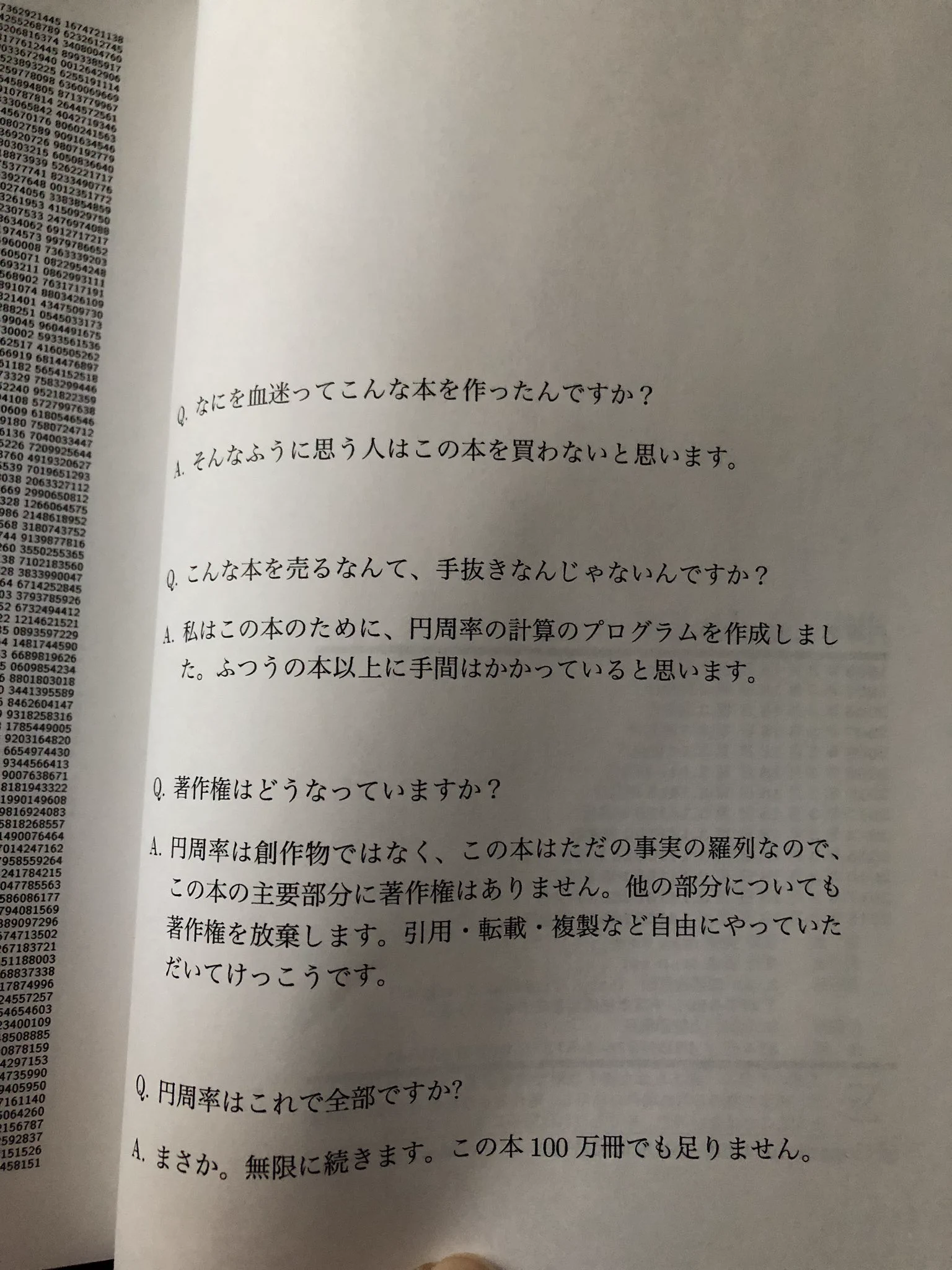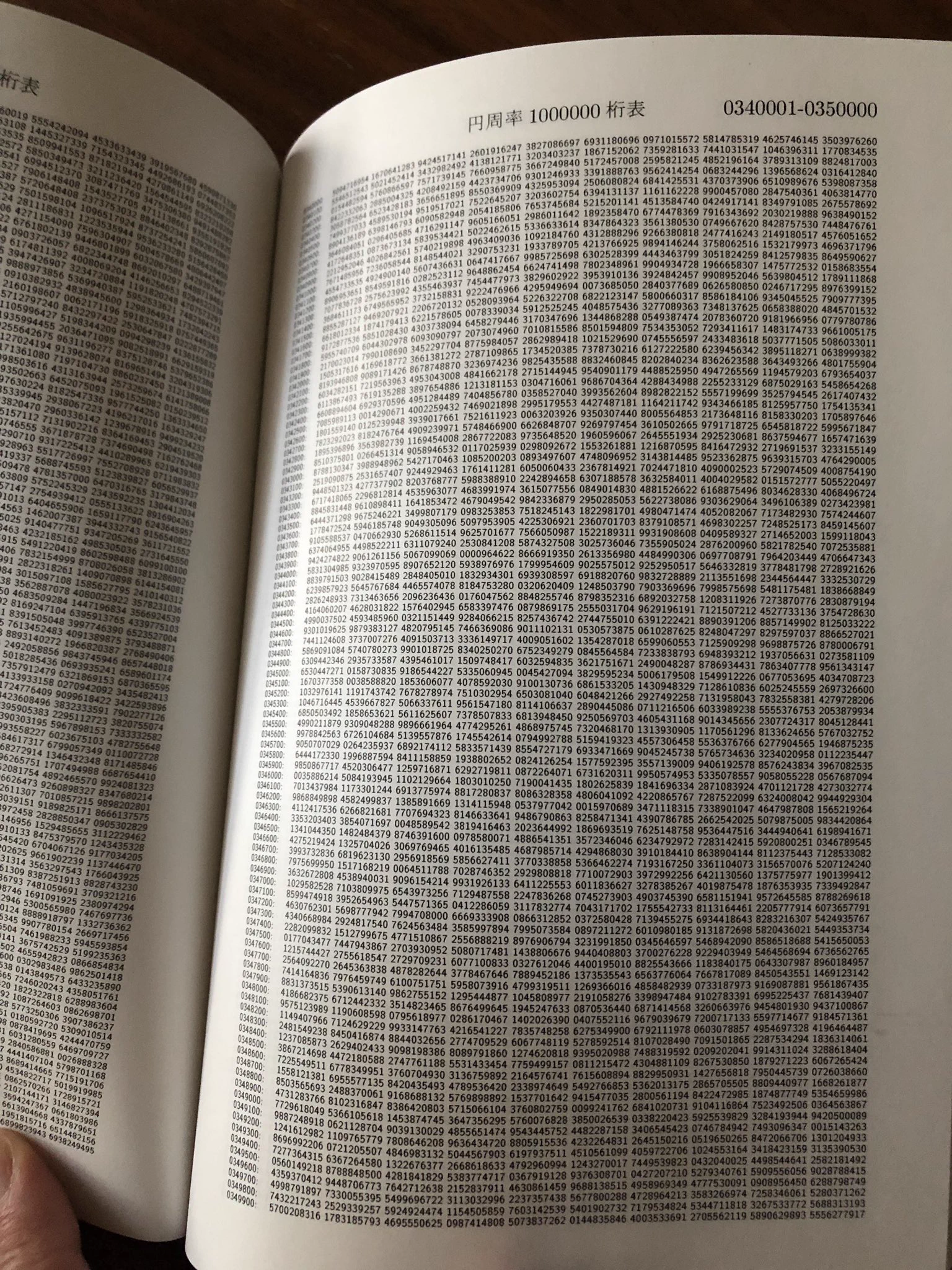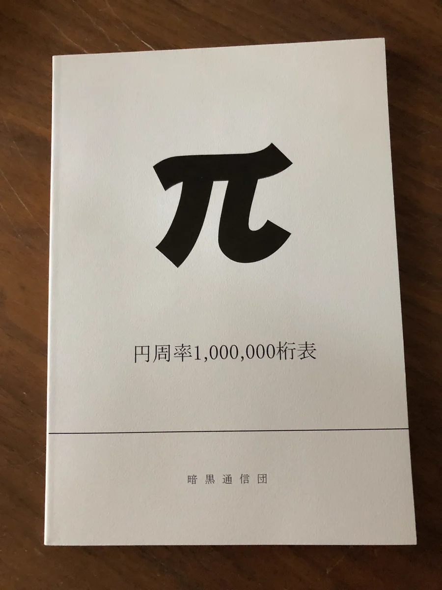円の周長の、直径に対する比率を表す「円周率」は無限に続いているものです。その円周率を100万桁打ち込んだだけの本が出版されていました。小さな文字で延々と円周率を書いてあるページがほとんどで、日本語は最後の1ページの後書きにあるのみでした。