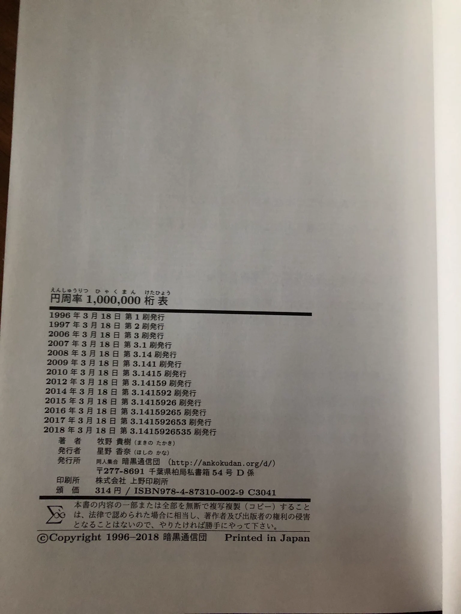 2006年から毎年増刷していて、「第○刷発行」の部分を円周率にしているところに、円周率への愛とお茶目さを感じられます。