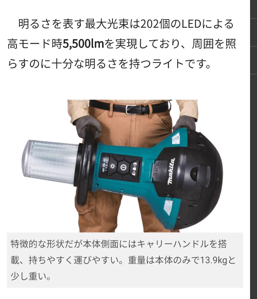 電動工具メーカーのマキタが販売する直立型充電式360°エリアLEDライト「ML810 」は重さ13.9kgということで、完全に現場用のライトでした。