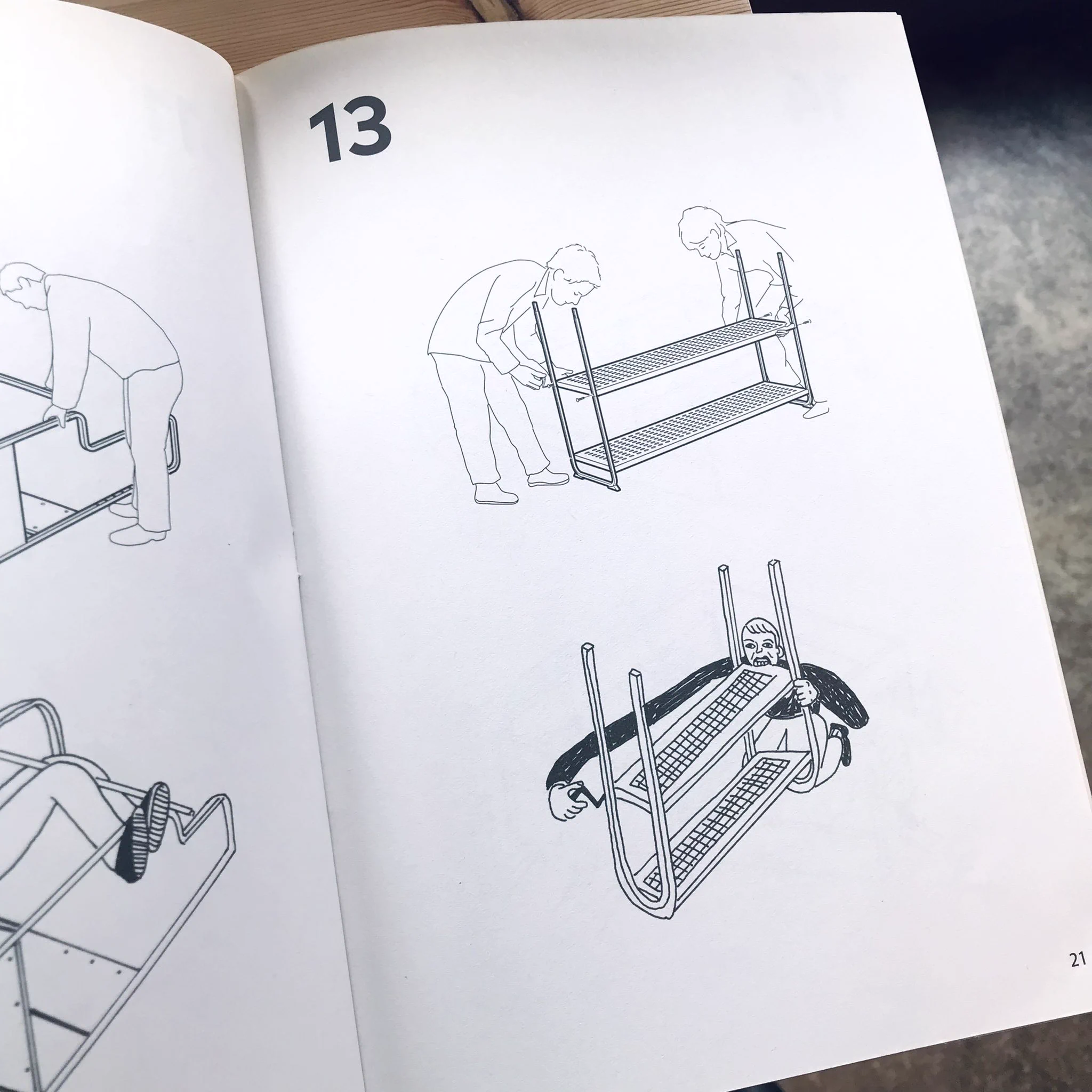 イケア(IKEA)はスウェーデン発祥の家具量販店で、オシャレな家具がリーズナブルに購入できるのが魅力ですよね。しかしその家具の多くは「購入後、自分で組み立てる事」が前提となっています。組み立ての説明書をみると方法が書いてあるのですが、イラストを見ると「二人で作業する方法」が描かれています。そこで画像では「一人で組み立てるイラスト」を描いてくれています。悪戦苦闘しています。